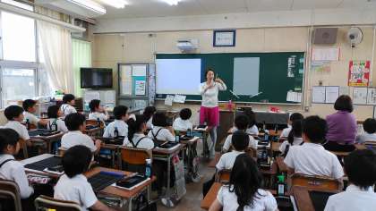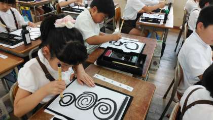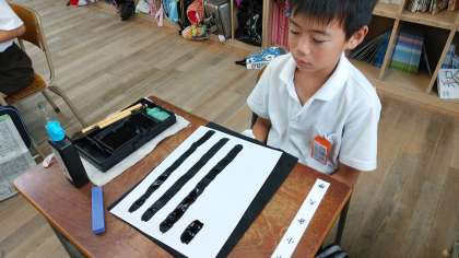 初めての習字の様子です。書写の先生の指導をしっかりと聞いて、真剣に取り組んでいました。手が黒くなった子もいましたが、楽しみながら頑張っていました。