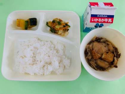 すき焼き煮は、牛肉の他にふ、糸こんにゃく、あつあげ、たまねぎ、えのきたけを入れて、甘辛く仕上げています。ごはんに合うメニューです。