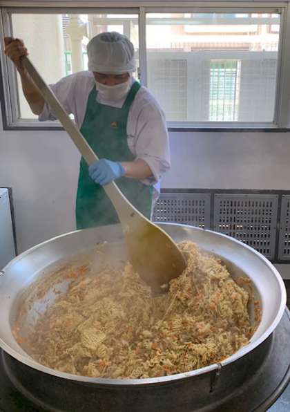今日の焼きそばは、豚肉、いかなどが入ったソース味の焼きそばでした。給食室では中華めんをさっとゆでて、具とともにいためるのですが、これがかなりの力仕事です。