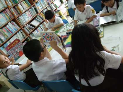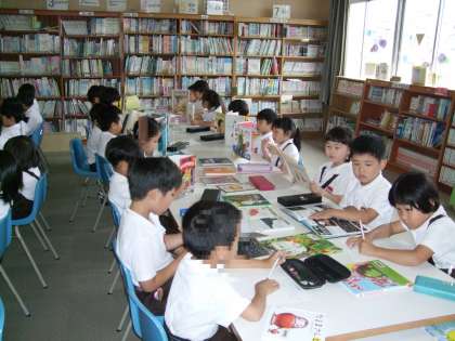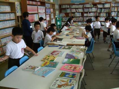 用意されている本の中から、表紙やタイトルを見て、読んでみたいなと思った本を手に取り、3分間読みます。続きが読みたいなと思った本は、また次回の図書の時間に借りることもできます。