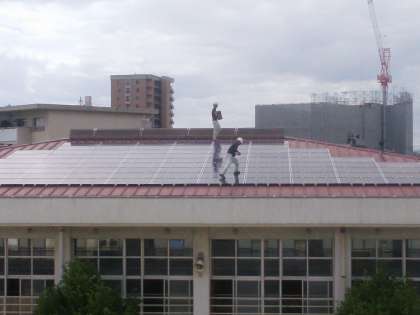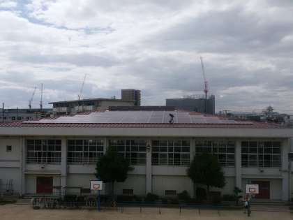 大阪市の施策で、体育館の東側の屋根に太陽光パネルを設置する工事を行っています。最終的には体育館の入口付近にその時の発電量が一目でわかるようなモニターも設置されます。