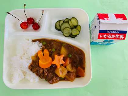 ハヤシライスは、手作りルウの仕上がりで味にちがいが出ます。給食調理員さんは、小麦粉と油を褐色になるまでしっかりいためたので、コクのあるハヤシライスになりました。そして星型とうさぎ型のラッキーにんじんが入りました。