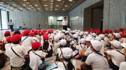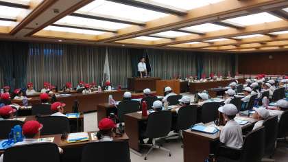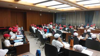 大阪市役所に社会見学に行きました。最初はロビーで担当の方の話をしっかり聞きました。特別委員会室で一人ずつ席に座りました。