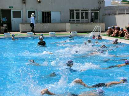 水泳の時間の途中には、休憩をはさんでお茶を飲んだり、日向ぼっこをしている子もたくさんいました。