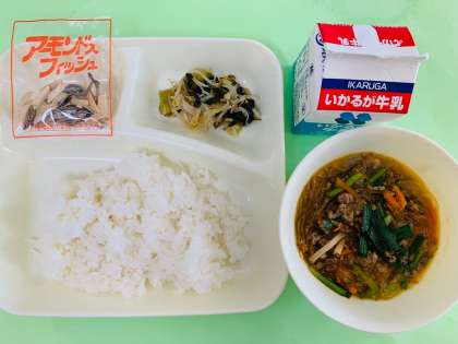 マーボーはるさめは、油としょうが、トウバンジャンをいためて香りを出し、牛・豚のひき肉と、にんじん、たまねぎ、たけのこ、しいたけを入れてさらにいため、さっとゆでたはるさめを加え、赤みそ、しょうゆなどの調味料で味つけしています。最後ににらが入って彩りもよいメニューです。