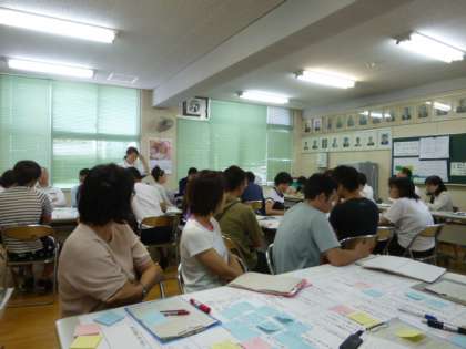 研究授業を受けて、放課後の研究討議会では、今日の授業について全員で考察します。よかったところや改善点など、よりよい授業づくりに向け、活発な意見が飛び交います。