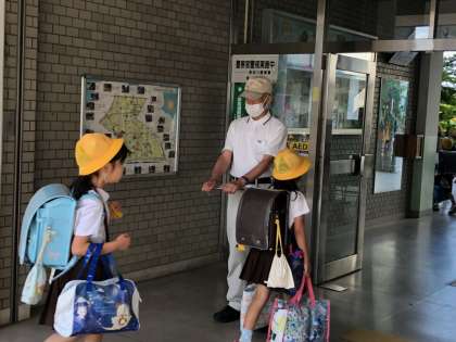 写真は登校指導の様子です。8時前から9時過ぎまで、子どもたちに声をかけながら、注意深く見守ってくださっています。特に遅刻の子には、丁寧に指導していただいています(写真の子は遅刻ではありません)。