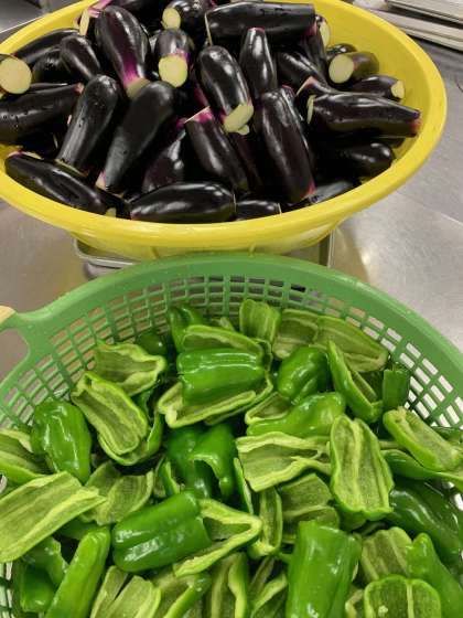 右の写真は、なすとピーマンを下処理したものです。ここにかぼちゃも入り、給食調理員さんは切るのにいっしょうけんめいでした。