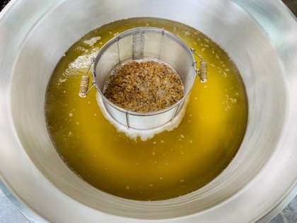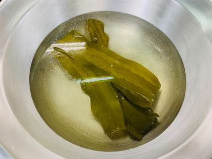 北海道産のこんぶをしばらく水に浸けた後、火にかけます。ふつふつとしてきたらこんぶを取り出し、けずりぶしを入れてひと煮立ちさせたら、火を止めます。給食では、右の写真のようなだし取り専用のかごにけずりぶしを入れて煮ます。こんぶとけずりぶしを使うことで、色もよく、うま味がつまっただしに仕上がります。