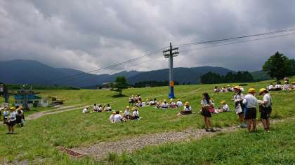 クラス写真の撮影を終え、草原で思い思いのお昼ごはんです。