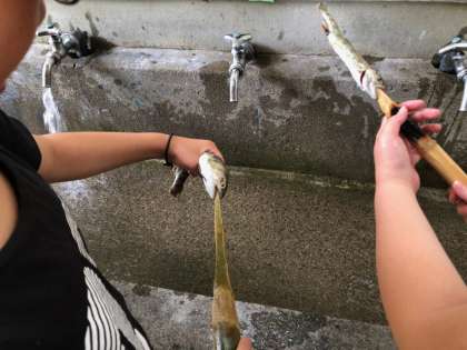 捕まえたら、塩を振って、竹串を刺して焼きます。