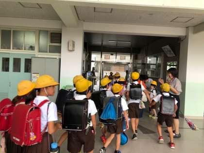 台風を想定した避難訓練を行い、地域子ども会ごとの集団下校をしました。