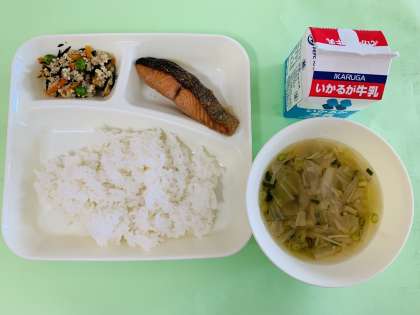 高野どうふのいり煮は、豚ひき肉とにんじん、ひじきをいためて味つけし、高野どうふの粉末を入れて煮ています。高野どうふのカルシウムとひじきのミネラルたっぷりの栄養価が高いメニューです。
