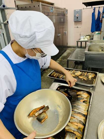 さけのしょうゆ風味焼きは、1人1切れのさけを料理酒、こい口しょうゆで下味をつけて焼いています。写真は、焼いたさけをクラスごとに数えて分けているところです。