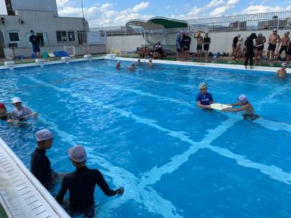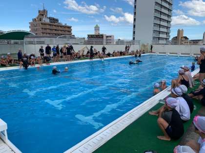 第3種目『ビート板に乗せろ!』、プールの横を二人組でビート板に乗せた球を落とさないように運ぶリレーです。二人の歩幅、呼吸が大切ですね!