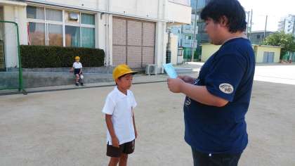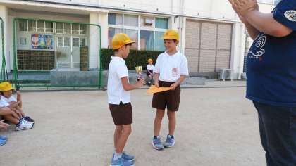 先週の金曜日に行ったプール大会の表彰式を行いました。クラスの代表の児童が前に出て、賞状を受け取りました。優勝した3組には優勝カップも送られました。