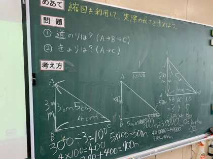 今日は、「実寸300mを3cmと表すとすると、A〜Cの道のりや距離は実寸でいくつになるか?」を考えました。