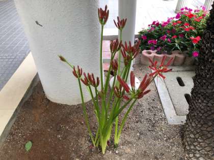 写真下)9月24日の彼岸花です。上の写真と同じ株です。ようやく一輪咲きました。「暑さ寒さも彼岸まで」といいますが、ずいぶん爽やかな天候になりました。