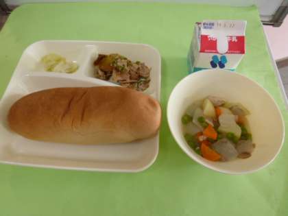 「スープ煮」は豚肉を主材にじゃがいも、たまねぎ、にんじん、青みに三度豆を使用した煮物です。