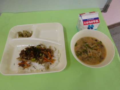 「みそ汁」はうすあげ、じゃがいも、もやし、しめじ、青みに青ねぎを使ったみそ汁です。
