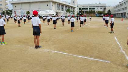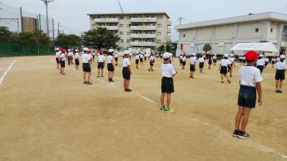 運動会のダンスの練習を始めて運動場で行いました。まずは、立ち位置がどこかを覚えます。広い運動場でどこに立つか、みんな真剣に確認していました。