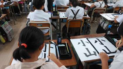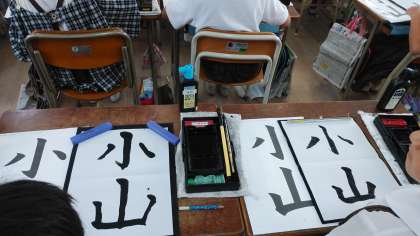 習字の学習の様子です。これまでは一文字を大きく書いていましたが、「小山」二文字にチャレンジしました。全体のバランス、中心も意識して書きました。