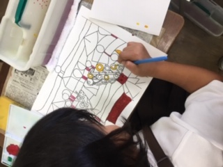 「女の館」と聞いてイメージして色塗り進めていきました。