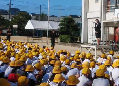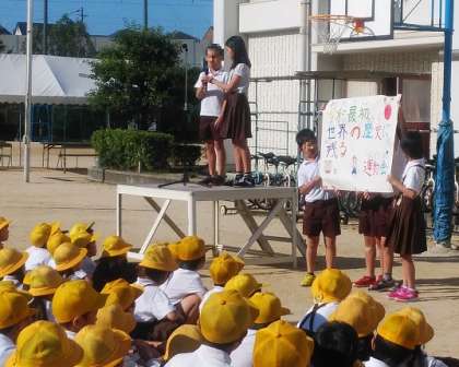 今日の児童朝会では、栄養教諭の教育実習生を紹介しました。