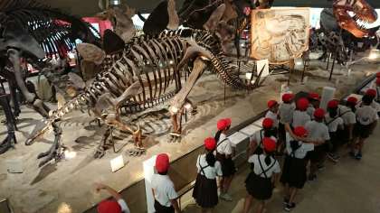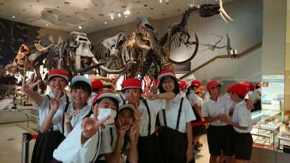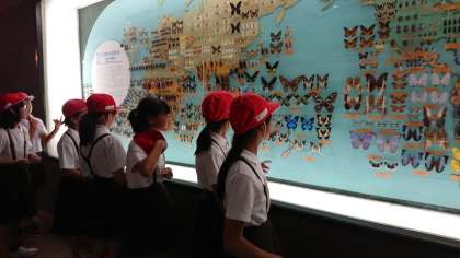 恐竜の骨が展示されているスペースでは、「おっきいなー」「こんなのが本当におったんかな」と、とても興味がひかれたようです。また、世界の蝶の分布図には、本物の蝶が展示され「きれいな色」「これ見たことある」という声がありました。足が止まるほどに子どもたちは展示をじっくりと見つめていました。