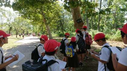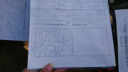 お弁当の後は、自然の観察をしました。公園の中にはたくさんの植物があり、植物の名前を調べたり、観察して絵を描いたりしました。一生懸命に活動に取り組んでいました。中には植物の名前を100以上見つけた子どもたちもいました。