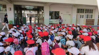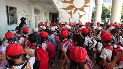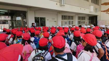 今日は見事に晴れて絶好の遠足日和でした。先生の話を聞いてから元気に出発しました。