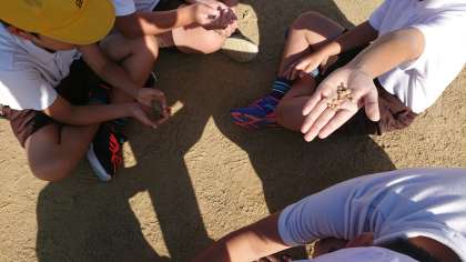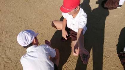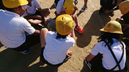集会の時間に石拾いをしました。けがをしないようにとたくさん石を拾っていました。