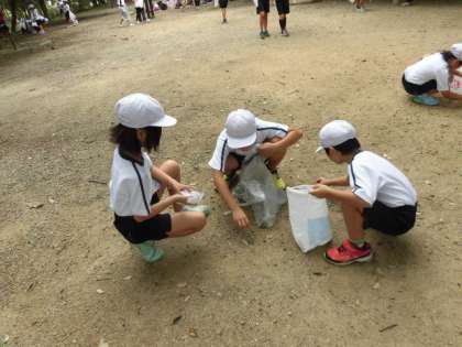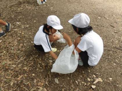 どんぐり拾いでは、落ち葉の上にたくさんのどんぐりが落ちていました。落ち葉をどけるといろいろな虫がいて、子供たちは喜んで観察していました。