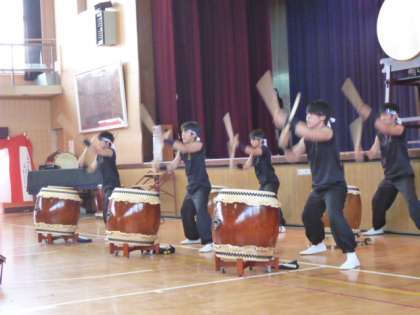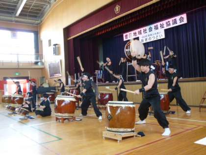 敬老のつどいの第2部は、大阪高等学校 和太鼓部(笑龍)による和太鼓の演奏でした。「初陣」や「獅子奮迅」など4曲が披露されました。