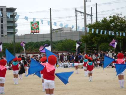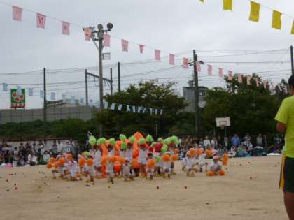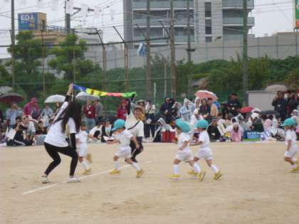 10月14日(月)体育の日、本校校庭にて、菅原天満幼稚園の運動会が開催されました。最初のかけっこでやや強めの雨が降ってきましたが、園児たちはなんのその、元気いっぱいに走っていました。