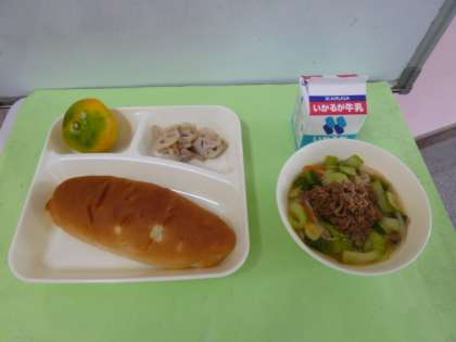 「タンタンめん」は、豚骨スープを使用し、チンゲンサイ、もやし、にんじんを使った汁めんに、挽肉、白ねぎ、しょうが、にんにくを使って、テンメンジャンや赤みそなどで味つけした肉みそを、配食時にのせて食べます。