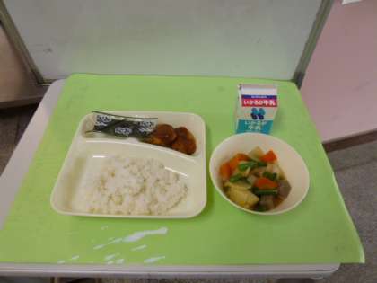 「じゃがいもと野菜の煮もの」は、じゃがいもを主材に、こんにゃく、たまねぎなどの野菜を使っています。これに「焼きのり」を組み合わせています。