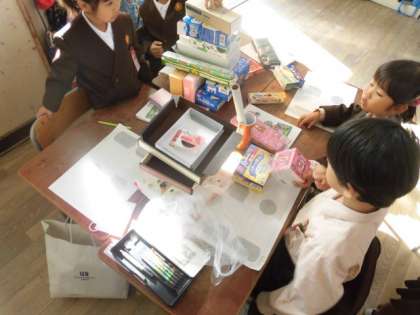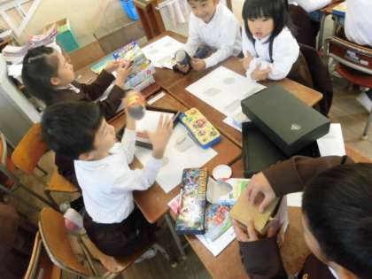 箱を見たり触ったりして、持ってきた箱を4つのグループに分けました。