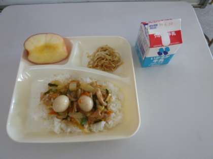「中華丼」は豚肉、うずら卵、旬のはくさい、たまねぎ、たけのこ、にんじん、にら、しょうがを使用し、塩、こしょう、こい口しょうゆで味付けし、最後にでんぷんでとろみをつけています。