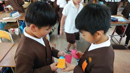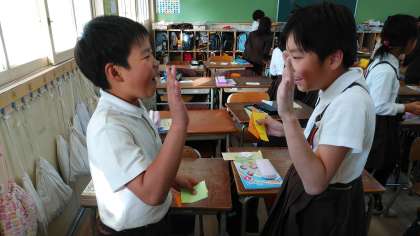 先週の外国語の学習の様子です。あいさつをしてから、自己紹介をしています。笑顔いっぱい、楽しみました。