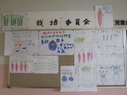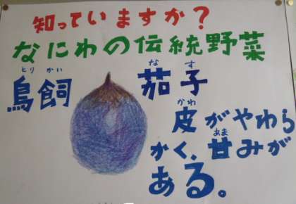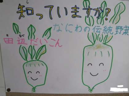 給食室横の掲示板に、栽培委員会が作成した、なにわの伝統野菜についてのポスターを貼っています。