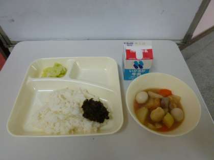 「関東煮」は、鶏肉、うずら卵、まる天を主材に、じゃがいも、こんにゃく、あつあげ、だいこん、にんじんを使用し、砂糖、みりん、塩、うす口しょうゆ、こい口しょうゆで味つけして煮含めます。「うずら卵の個別対応献立」です。
