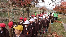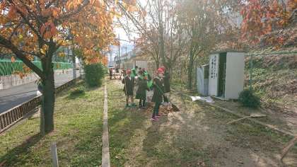 公園に到着し、大きな声であいさつをしてから清掃を始めました。たくさんの落ち葉を熊手やほうきで集め、どんどん袋に詰めていきました。