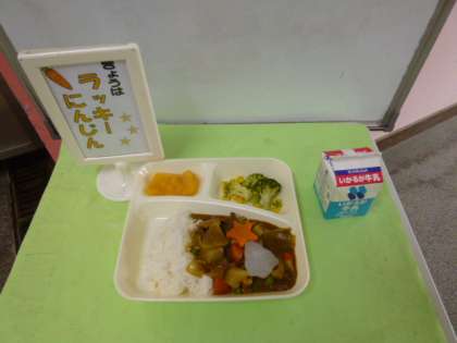 「冬野菜のカレーライス」は、旬のだいこんやれんこんを使用しています。この献立にはラッキーにんじんと大根のツリーが入っています。写真にも写っていますね。