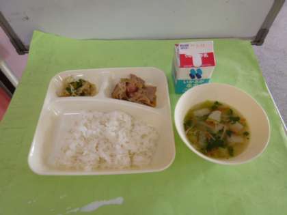 「焼き肉」は豚肉ににんにく、砂糖、あかみそなどの調味料で下味をつけ、焼き物機で焼いています。