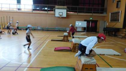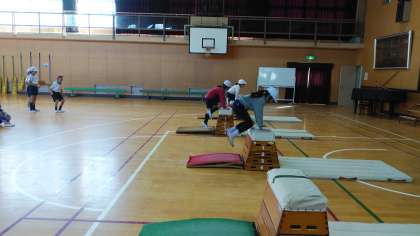 跳び箱の練習の様子です。3年生では、開脚跳び・台上前転・閉脚跳び(かかえこみとび)を練習しました。写真は閉脚跳びの練習をしているところです。最初は怖がっていた子もいましたが、少しづつチャレンジすることができました。