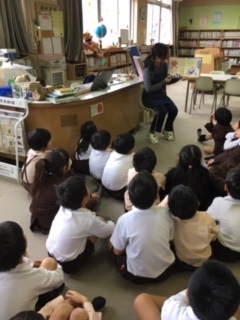 図書の時間に、図書館補助員の稲生さんに読み聞かせをしてもらいました。