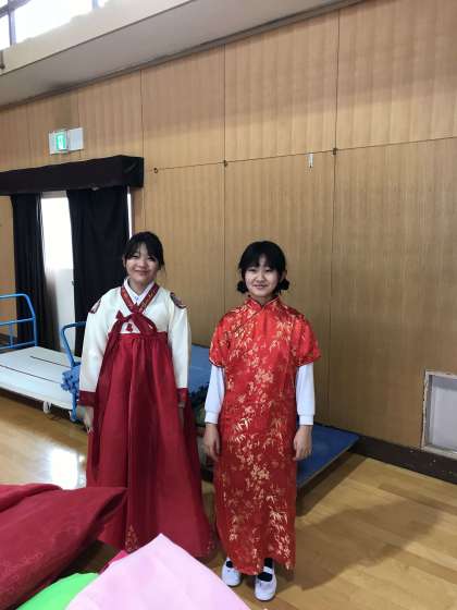 韓国朝鮮の民族衣装を着たり、楽器をたたいたり、ペンイなどの遊びをしたりと身近な国の文化に触れました。