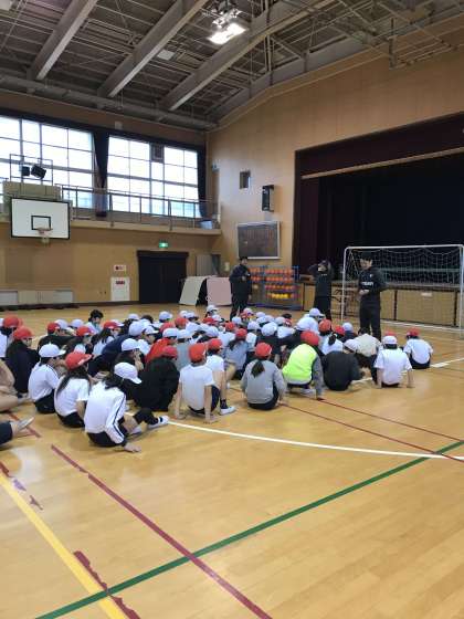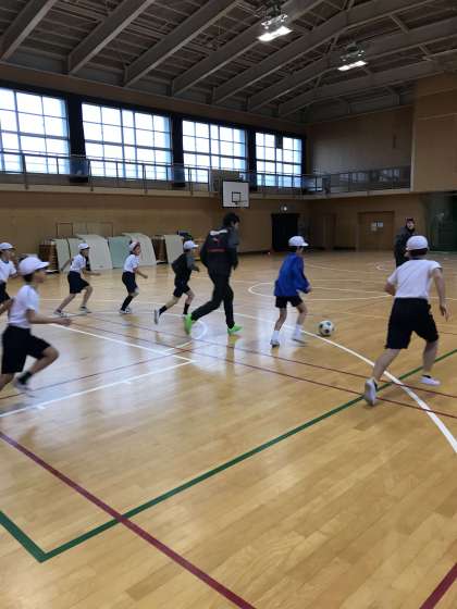セレッソ大阪のスタッフの方々に来ていただき、サッカーの楽しさを教わりました。あいにくの雨で、講堂で行うことになりましたが、ドリブルをしたり、スタッフの方々と試合をしたりと楽しい時間を過ごしました。