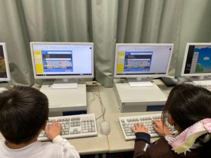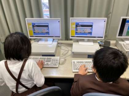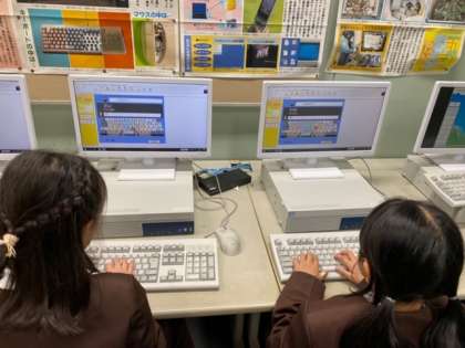 パソコンで、キーボードのホームポジションやそれぞれのキーを打つ指に気をつけて文字を打つ練習をしました。